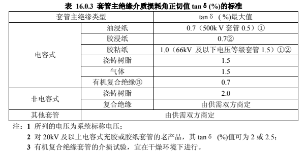 1)套管主絕緣的介質損耗角正切值超過表 16.0.3 中的規定值;