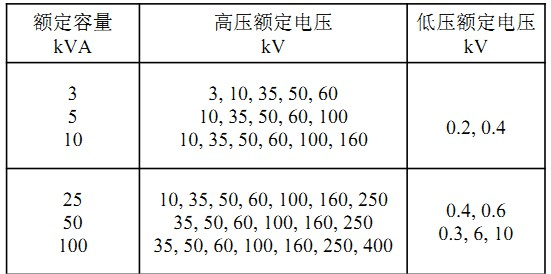 b)額定容量與高、低壓繞組電壓配合建議采用表1的推薦值,特殊要求時,由制造廠與用戶雙方協商確定。